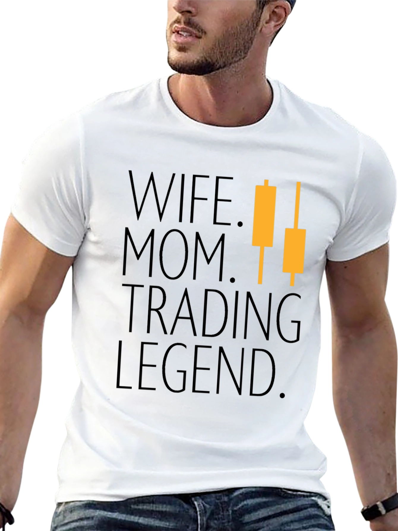 This classic black t-shirt features a bold graphic print declaring "WIFE. MOM. TRADING LEGEND." The design incorporates symbolic candlestick chart imagery, appealing to women involved in stock trading. The shirt's casual style and comfortable fit make it ideal for everyday wear, whether at home, running errands, or participating in online trading communities. Show off your passions and skills with this unique and empowering shirt. This tee is a statement piece that celebrates successful women in finance.