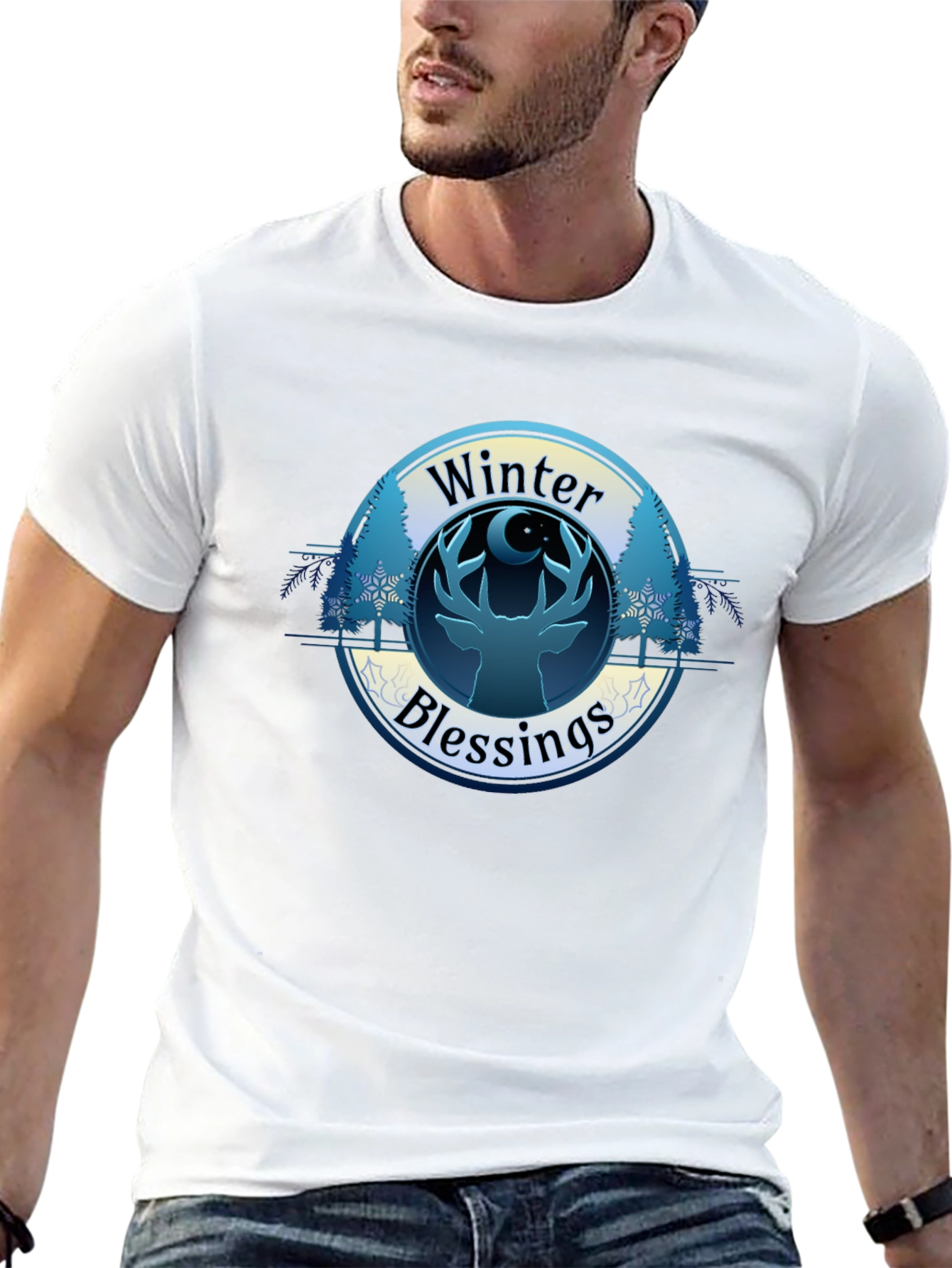 Embrace the serenity of the season with our 'Winter Blessings' tee. The striking emblem showcases a majestic deer silhouette beneath a crescent moon and starry night, framed by frosted winter trees. The graphic is set within a classic circular design, set against a deep black backdrop. Crafted for comfort, the tee is perfect for casual wear, holiday gatherings, or cozy nights in. A stylish way to express your love for winter's beauty.