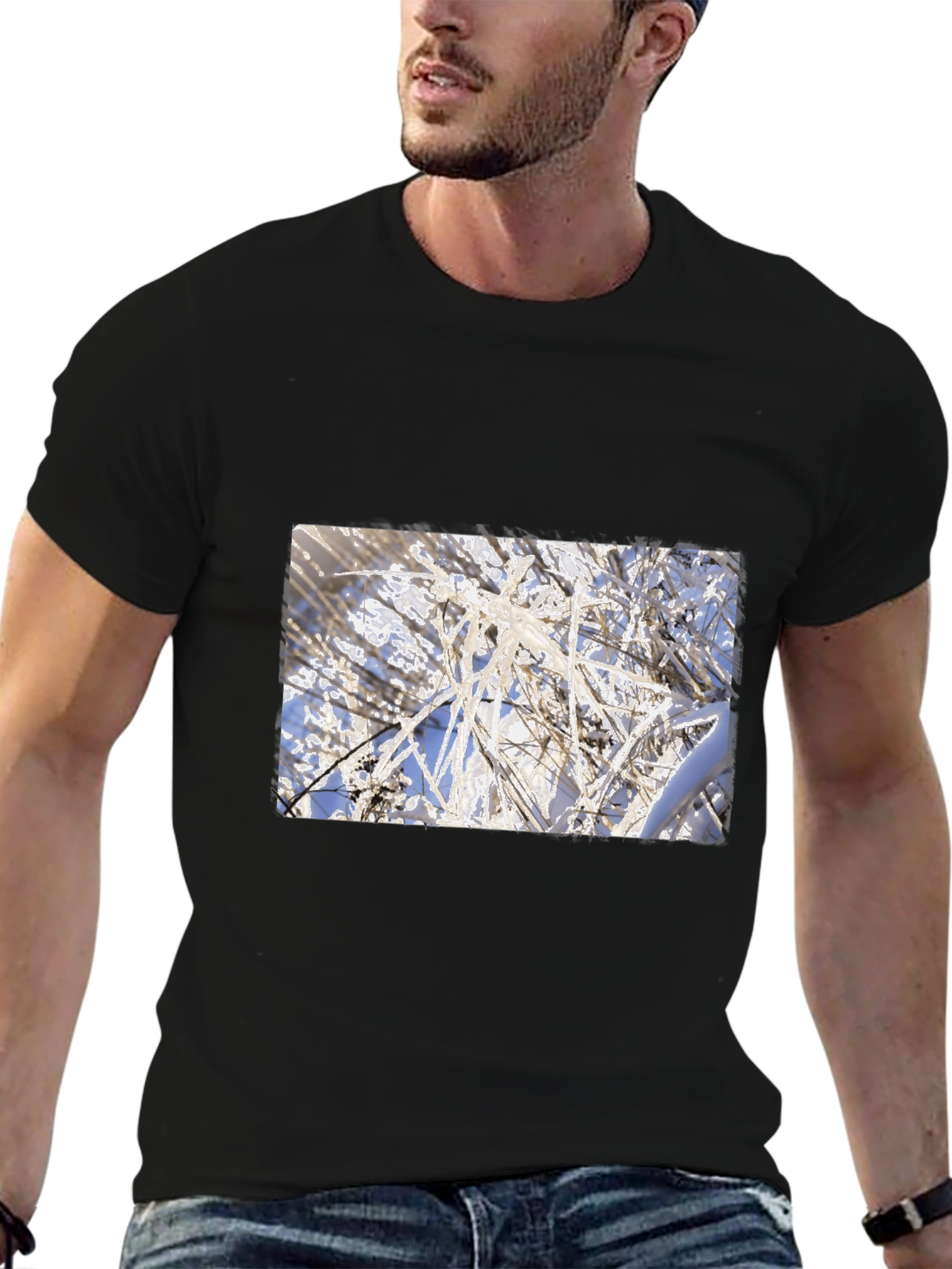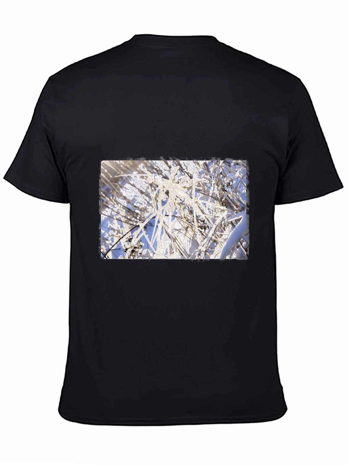 Embrace the winter season with this stylish black graphic tee. The design features a close-up image of frost-covered branches against a bright sky. Crafted from a soft cotton blend, this tee offers both comfort and durability. It's perfect for everyday wear or layering under a jacket during cooler months. The unique graphic adds a touch of nature-inspired style to your wardrobe. Show off your love for winter landscapes with this eye-catching tee. The classic crew neck and short sleeve design make it a versatile choice for any casual occasion. Get yours today and make a bold statement!