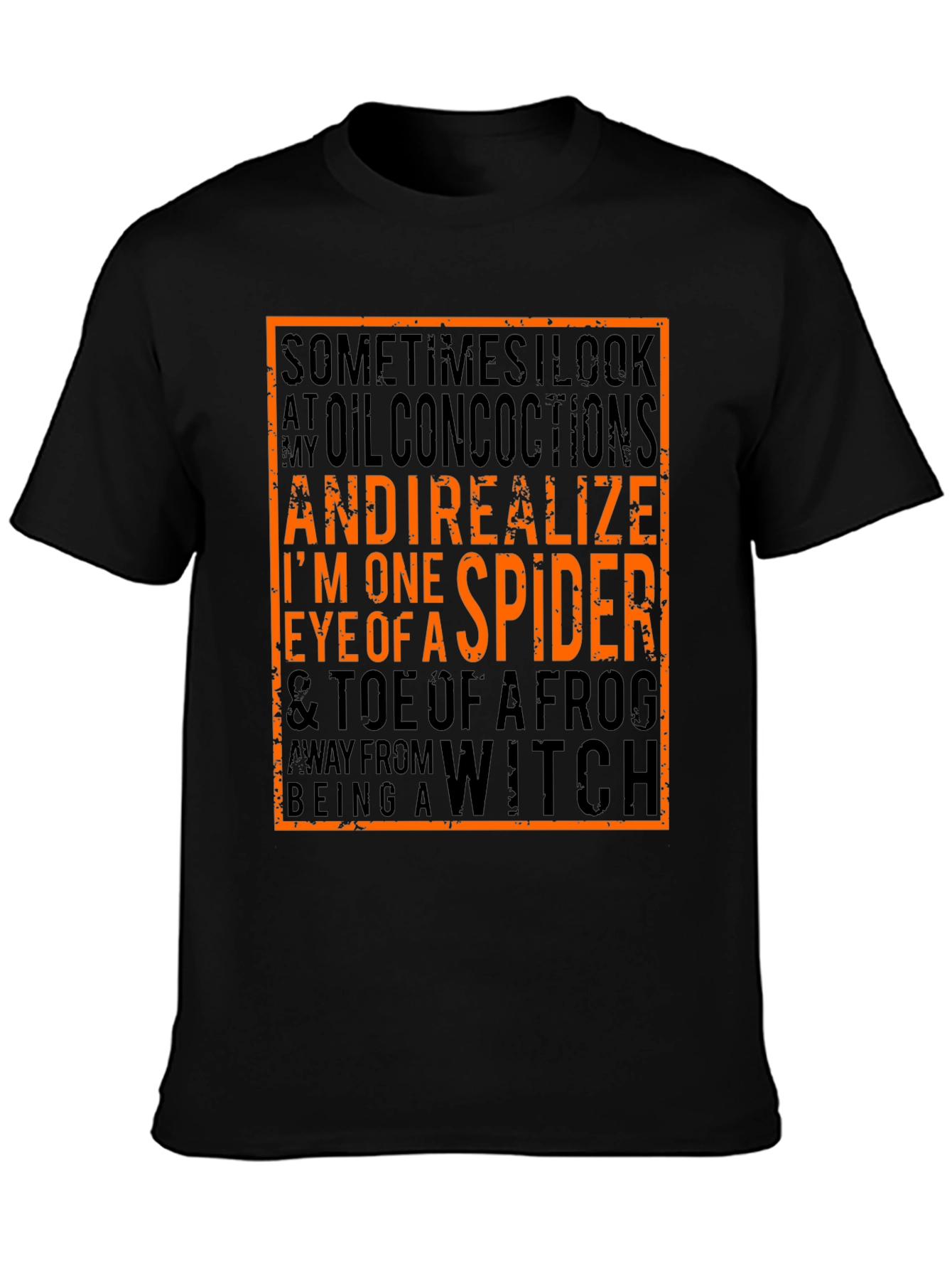 This black t-shirt features a bold, orange graphic design with a humorous witch-themed quote. The text reads: 'Sometimes I look at my oil concoctions and I realize I'm one eye of a spider and toe of a frog away from being a witch.' The distressed font and rectangular border give it a vintage, edgy feel. Made from a comfortable-looking fabric, this tee is perfect for casual wear, Halloween parties, or anyone with a quirky sense of humor. It's a great conversation starter and a fun way to express your unique style. The fit appears to be a standard unisex style, making it a versatile addition to any wardrobe.