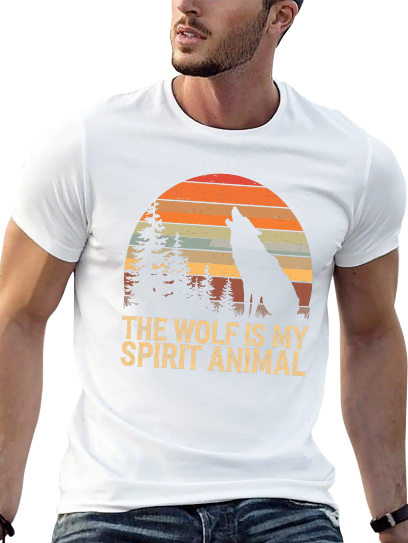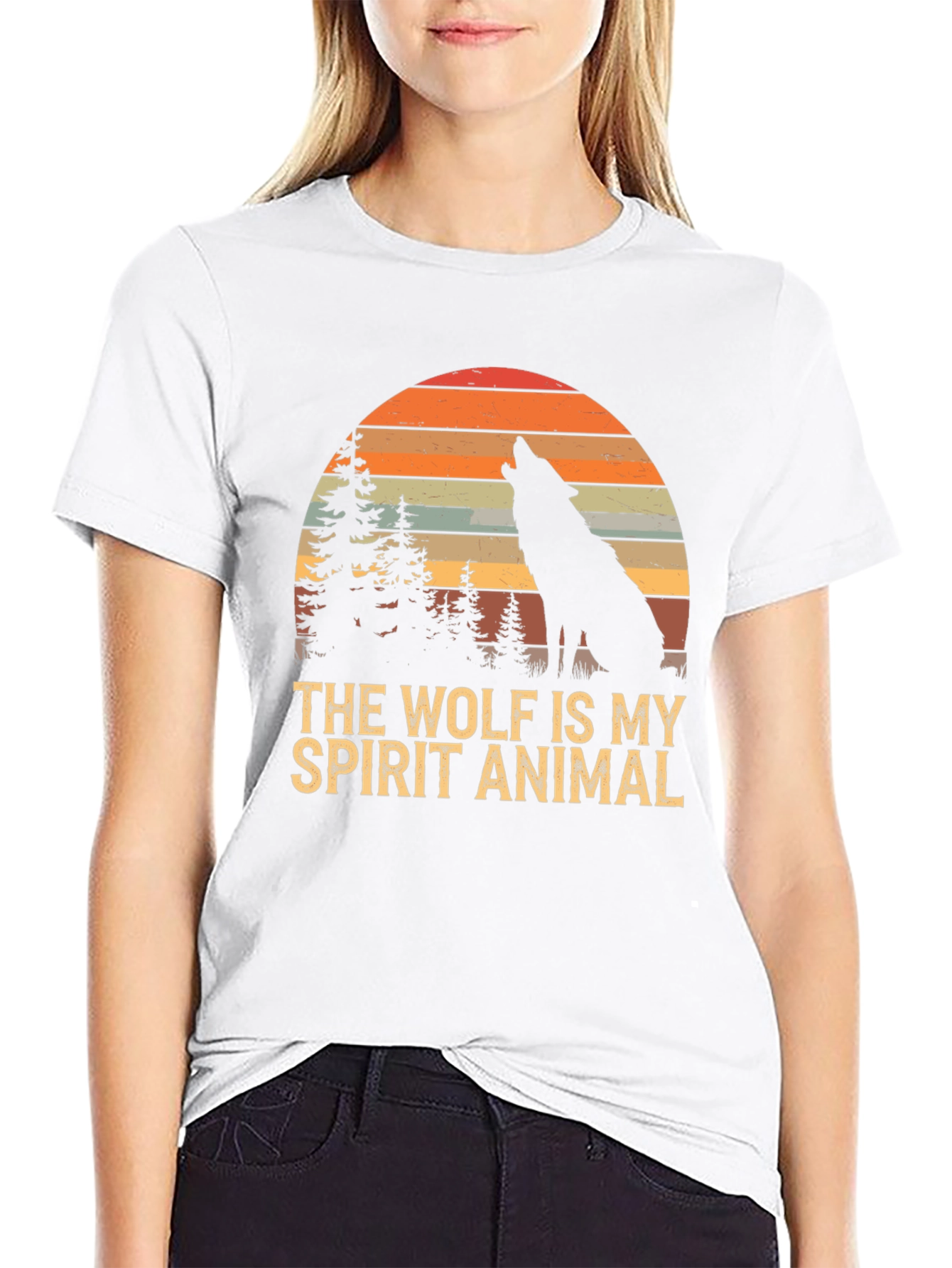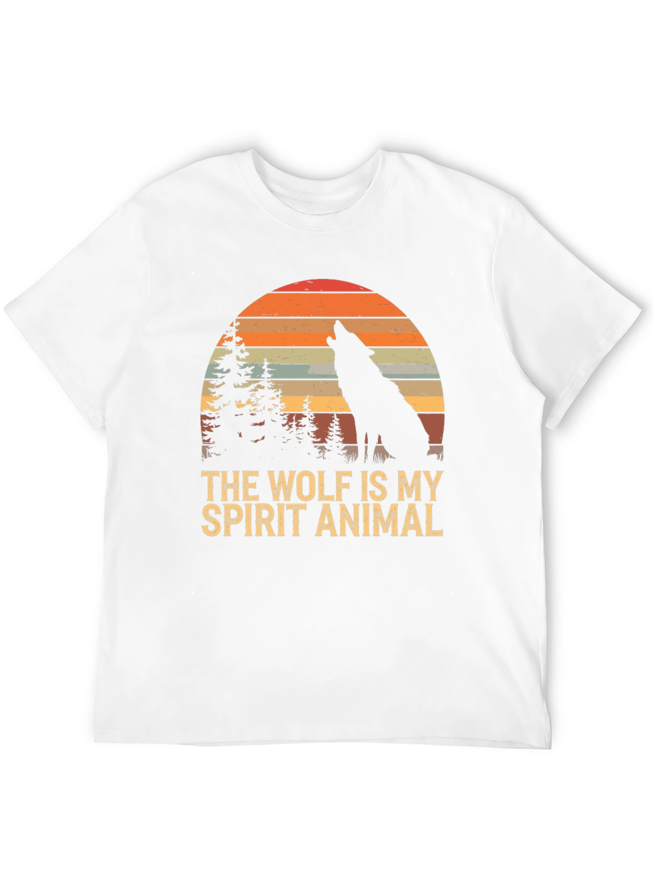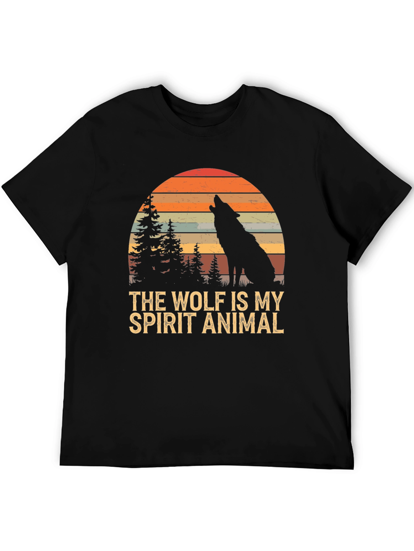Embrace your wild side with this striking black T-shirt featuring a unique graphic design. The print showcases a silhouette of a wolf howling under a vibrant, retro-style sunset backdrop with pine trees, encapsulating a serene wilderness scene. Boldly printed beneath is the phrase "THE WOLF IS MY SPIRIT ANIMAL" in an eye-catching vintage font. Made from what appears to be a soft and comfortable fabric, this short-sleeved tee offers a relaxed fit perfect for everyday wear. Ideal for nature lovers, wolf enthusiasts, or anyone who appreciates unique graphic apparel. Express yourself and channel your inner wolf with this standout piece!