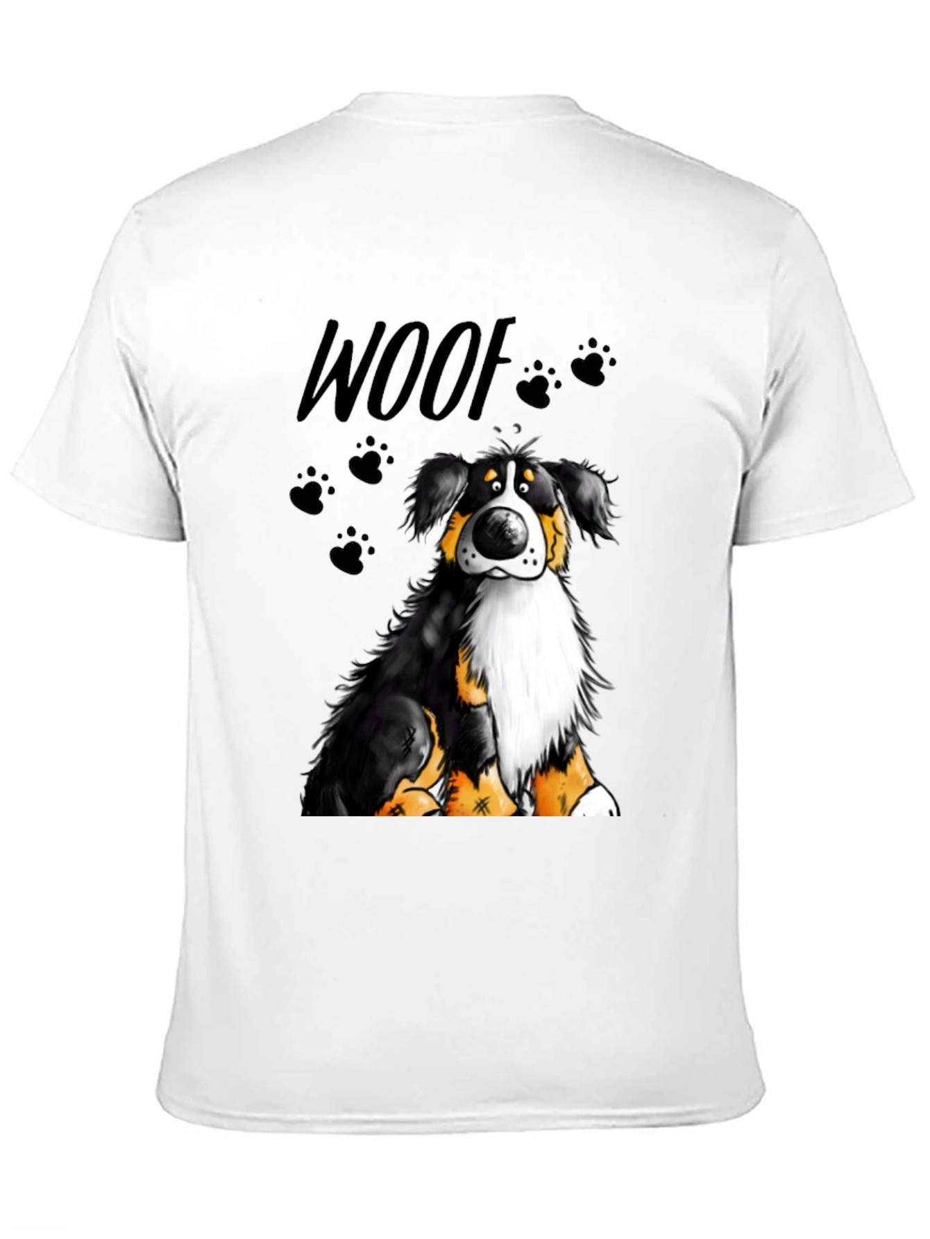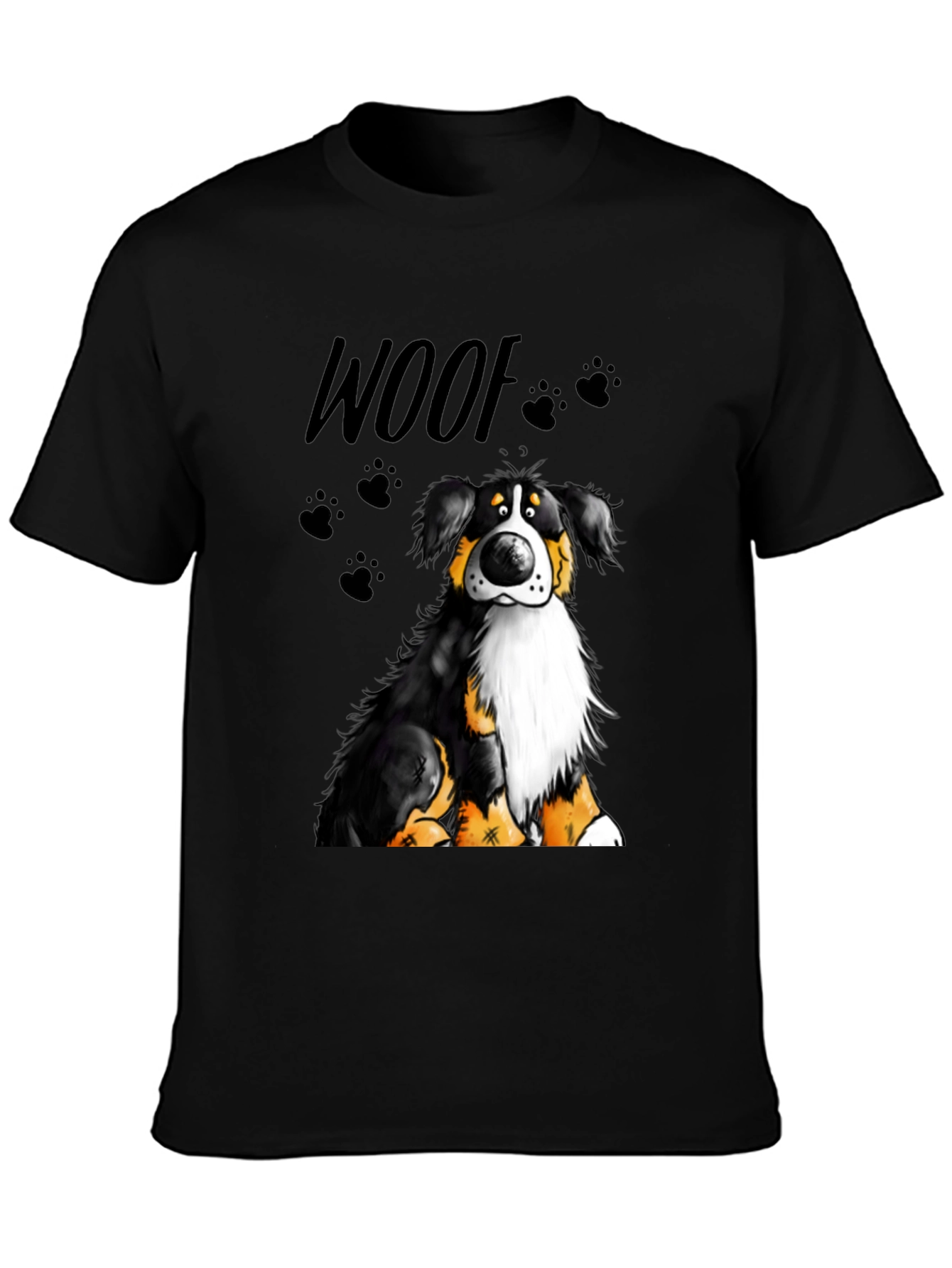 Show off your love for dogs with this unique black graphic t-shirt. The shirt features a playful "WOOF" text design accompanied by paw prints and an adorable illustration of a Bernese Mountain Dog. The print boasts vibrant colors and sharp details, making it an eye-catching piece. Crafted from a comfortable, breathable fabric, this short-sleeve crew neck tee is perfect for casual wear. Whether you're running errands, hanging out with friends, or simply relaxing at home, this shirt is a great way to express your love for furry friends.