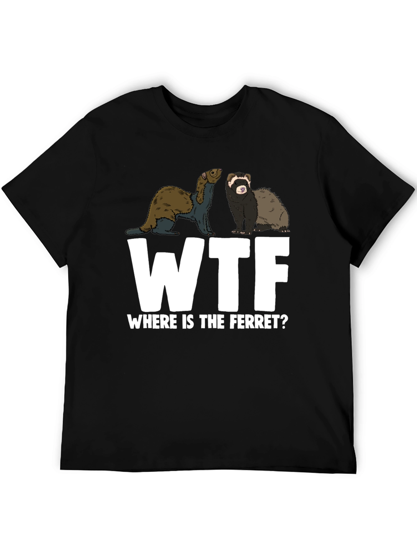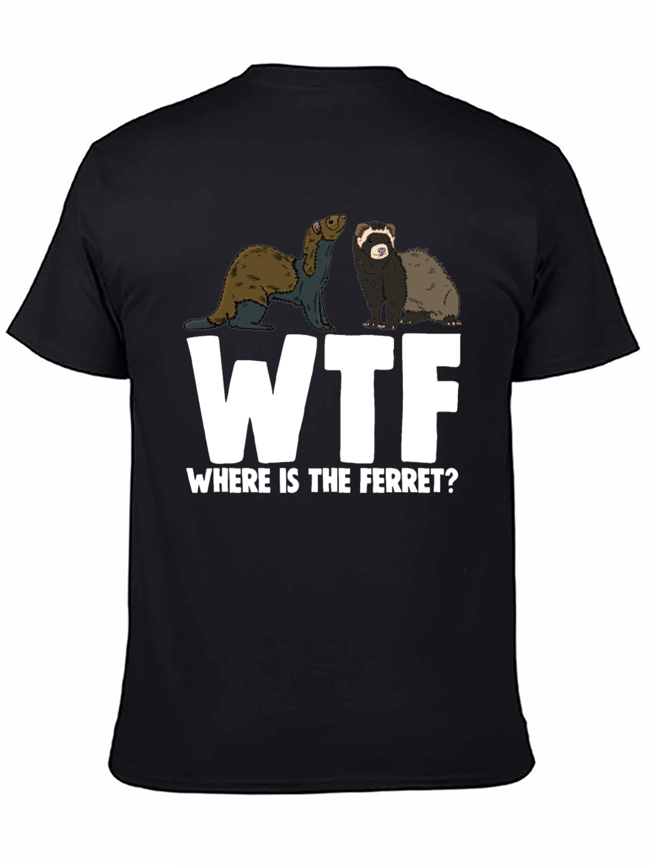 This eye-catching black t-shirt features a playful design with cartoon ferrets and the text "WTF WHERE IS THE FERRET?" in bold, white lettering. Made from a comfortable-looking fabric, this shirt is perfect for casual wear. The witty slogan adds a touch of humor. This unique tee is ideal for ferret lovers or anyone with a quirky sense of style. Whether you're lounging at home or out with friends, this shirt is sure to spark conversations and showcase your fun personality. Show off your love for these cute creatures and add a playful edge to your wardrobe with this statement tee.