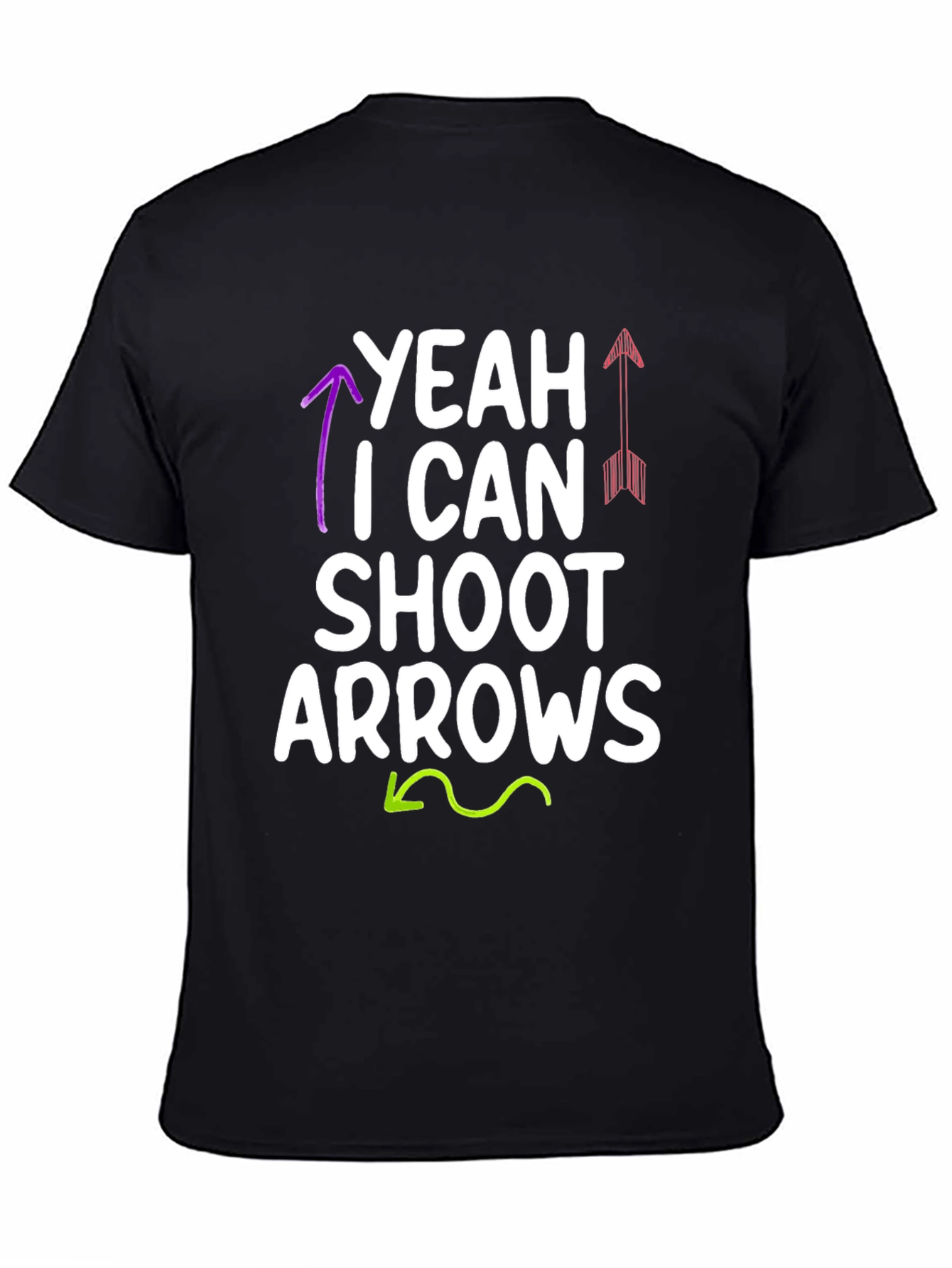 Show off your archery skills with this fun "Yeah I Can Shoot Arrows" T-shirt! This black tee features a playful design with the phrase in bold white lettering, accented by arrow illustrations in purple, red, and green. Made from a comfortable and durable fabric, this shirt is perfect for casual wear, archery practice, or as a gift for the archer in your life. Its classic fit ensures a relaxed and flattering silhouette. Make a statement and let everyone know you're ready to hit the target in style!