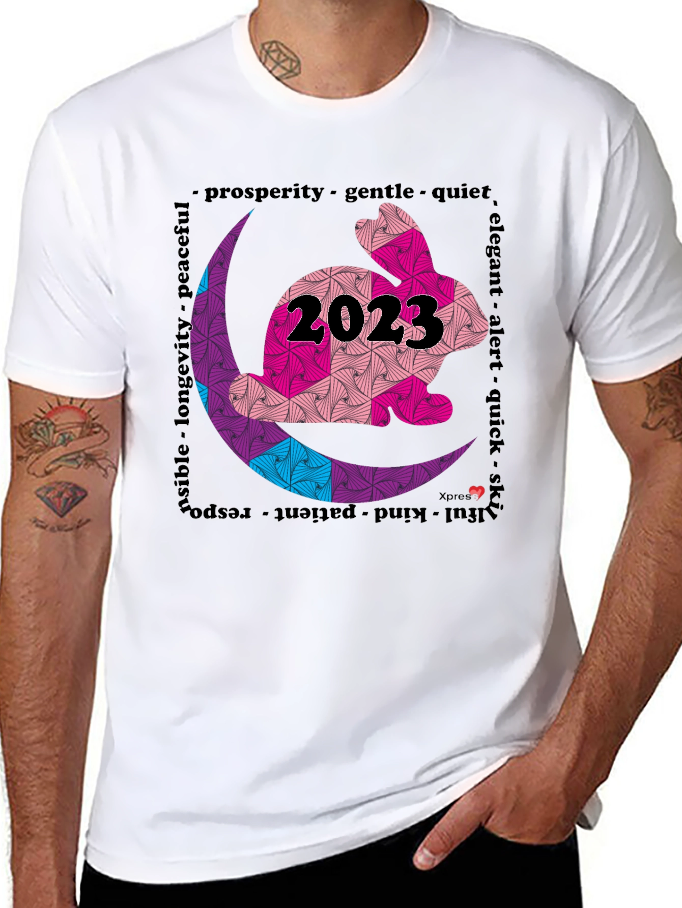 Celebrate the Year of the Rabbit with this unique black t-shirt. The design features a colorful mosaic rabbit silhouette sitting on a crescent moon. The year "2023" is boldly displayed on the rabbit. The graphic is surrounded by positive traits like "prosperity", "gentle", "kind", and "peaceful", making it a great way to welcome the Lunar New Year. Made from comfortable fabric, this tee is perfect for casual wear. Show off your zodiac pride and style with this eye-catching shirt!