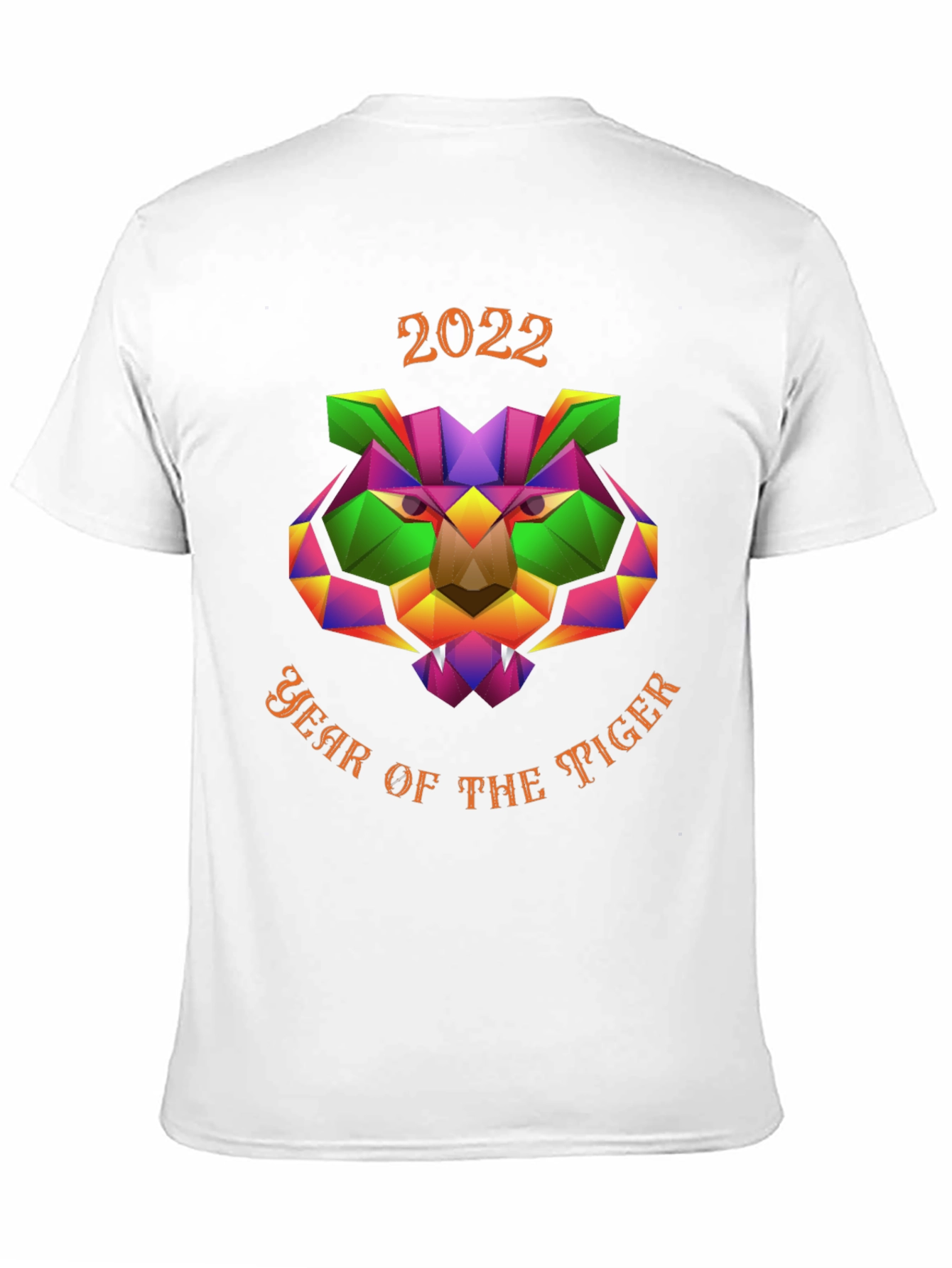 Celebrate the Chinese New Year in style with this unique 'Year of the Tiger' graphic t-shirt. Featuring a vibrant, geometric tiger design in a spectrum of colors, paired with '2022' and 'Year of the Tiger' text, this tee is a bold statement piece. Made from comfortable, dark-colored fabric, this t-shirt is perfect for casual wear, festive gatherings, or as a thoughtful gift. Show off your zodiac pride and embrace the spirit of the Tiger with this eye-catching design!