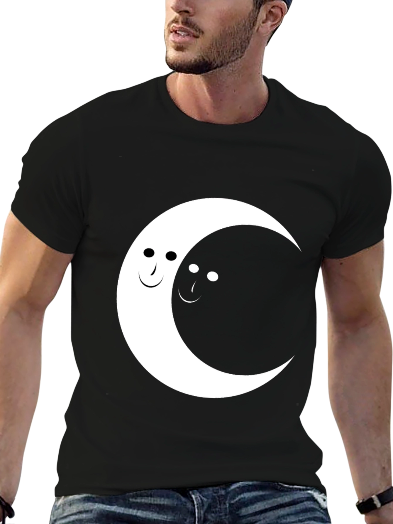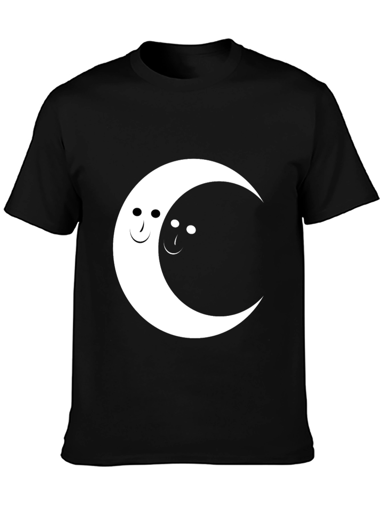 This striking black t-shirt features a unique graphic design of two crescent moons forming a yin yang symbol. One moon is white with a smiling face, while the other is black with a similar smiling expression, creating a playful yet balanced aesthetic. The shirt appears to be made from a comfortable, soft cotton blend, perfect for everyday wear. The classic crew neck and short sleeves offer a timeless, versatile fit. This t-shirt is ideal for casual outings, lounging at home, or expressing your unique style. Add this eye-catching conversation starter to your wardrobe today!