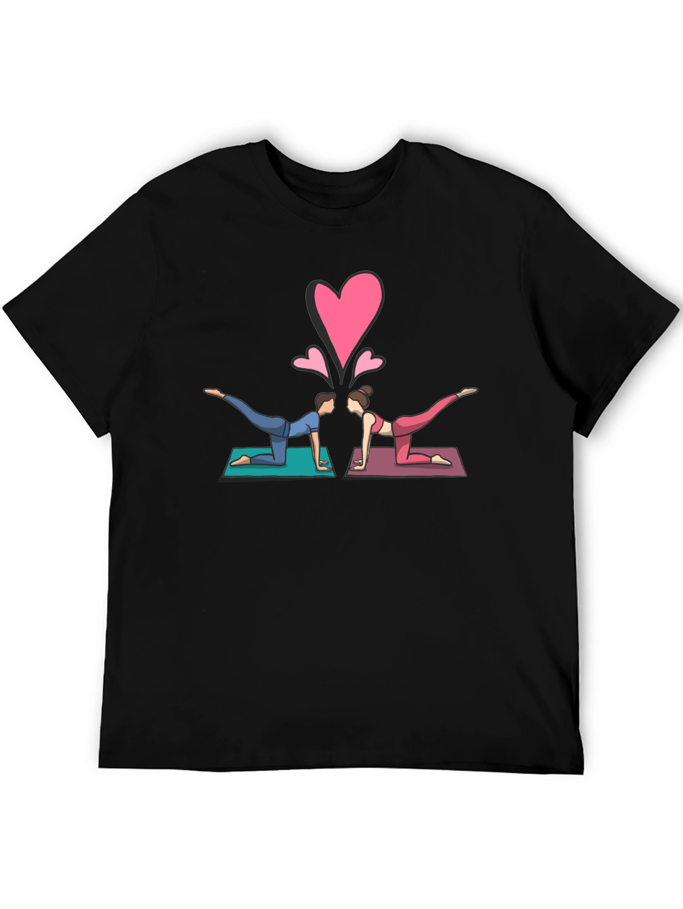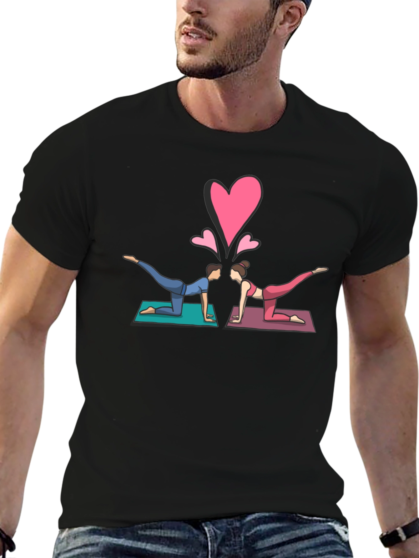 Show your love for yoga with this unique black t-shirt. The design features two figures in a mirrored yoga pose, creating a heart shape above them, symbolizing connection and love. Perfect for yoga enthusiasts, couples who enjoy yoga together, or anyone who appreciates a touch of zen in their wardrobe. Made from comfortable materials, this tee is ideal for everyday wear, yoga classes, or casual outings. A thoughtful gift for the yogi in your life!
